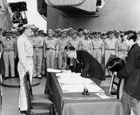 昭和20年・1945年8月14日のポツダム宣言の受諾通告の後、同年9月2日に、東京湾内に停泊したアメリカ海軍の戦艦ミズーリの甲板上において、日本側を代表して重光葵外相、梅津美治郎参謀総長、連合国を代表して連合国最高司令官のマッカーサーが「降伏文書」に署名を行い、これによって日本の降伏が確定した。