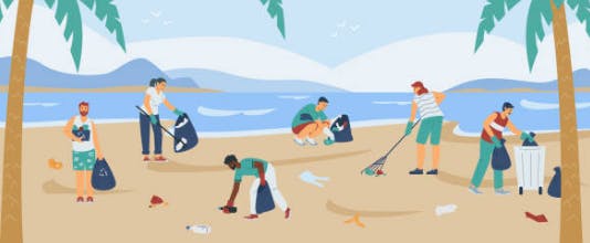 海岸のごみを拾い集め