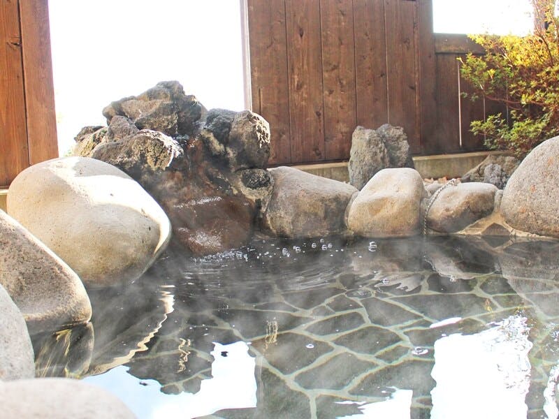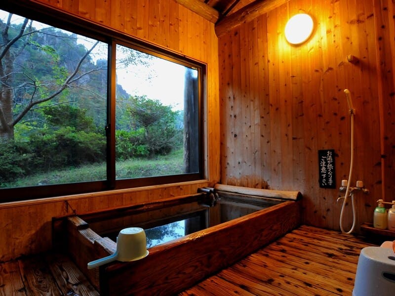 当閣では渓流を臨む露天風呂、大浴場、それからお部屋の内風呂、自家源泉かけ流しの三つのお風呂を楽しめます。