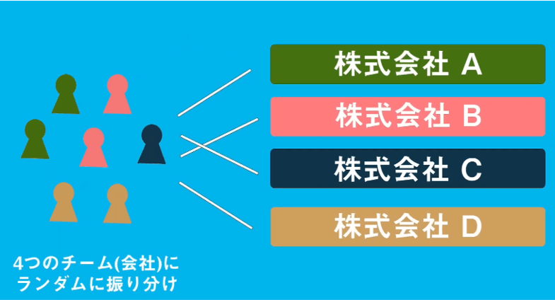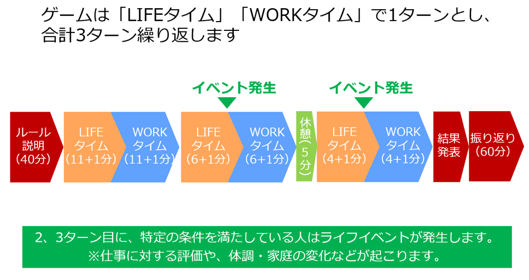 参加者はチーム(会社)ごとに振り分けられ、ワーク(仕事)とライフ(プライベート)の時間を過ごしながら、売り上げを競います。ワークタイムではチームの仲間とライフタイムではそれぞれのパートナーと過ごします。
