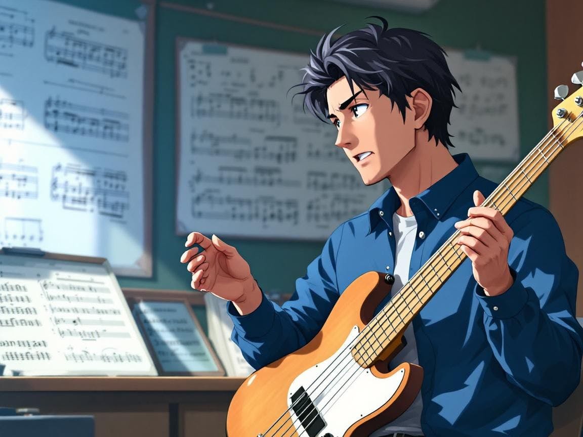 指弾き・ピック弾きの基礎、ルート弾きからリズムの作り方まで、バンド演奏を見据えた練習内容を丁寧に解説。