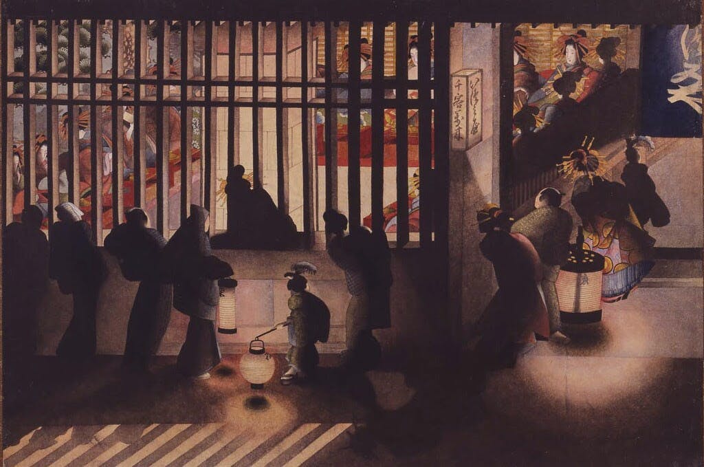 灯篭の明かりを頼りに短冊に筆を走らせる女性が描かれており、