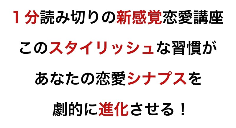 毎回、1分流し読み程度のボリュームで、実践的、且つ必要にして十分なノウハウが身に付くような構成でお届けいたします。忙しいあなたのための、スリムでスタイリッシュな恋愛リソースとしてご活用いただけます。
