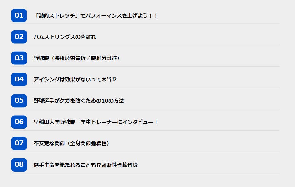 「秘密のページ」では、特典として、野球のコンディショニングについてより深く解説したコンテンツを多数提供しています。