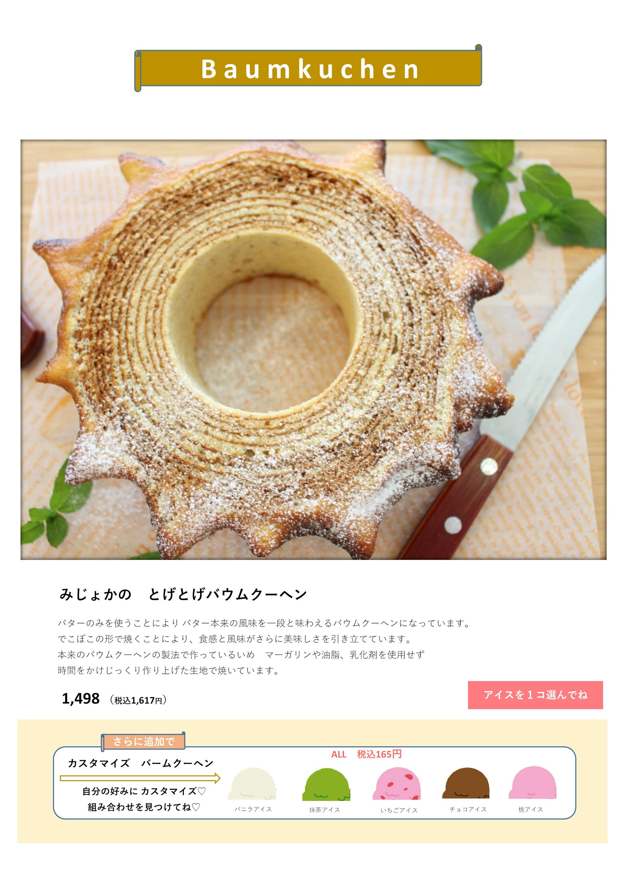 通常サイズの バウムクーヘンへ トッピングをして 提供しています。