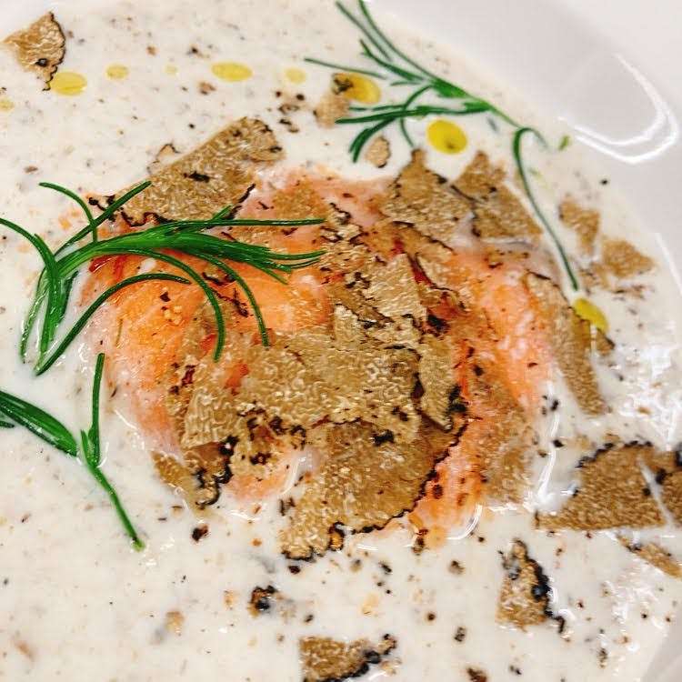 キノコのうま味たっぷりのクリームソースに合わせるのがやわらかく低温調理したお魚(魚は日替わりになります。)さらにさらに上から香りの王様トリュフをシャリシャリ♪