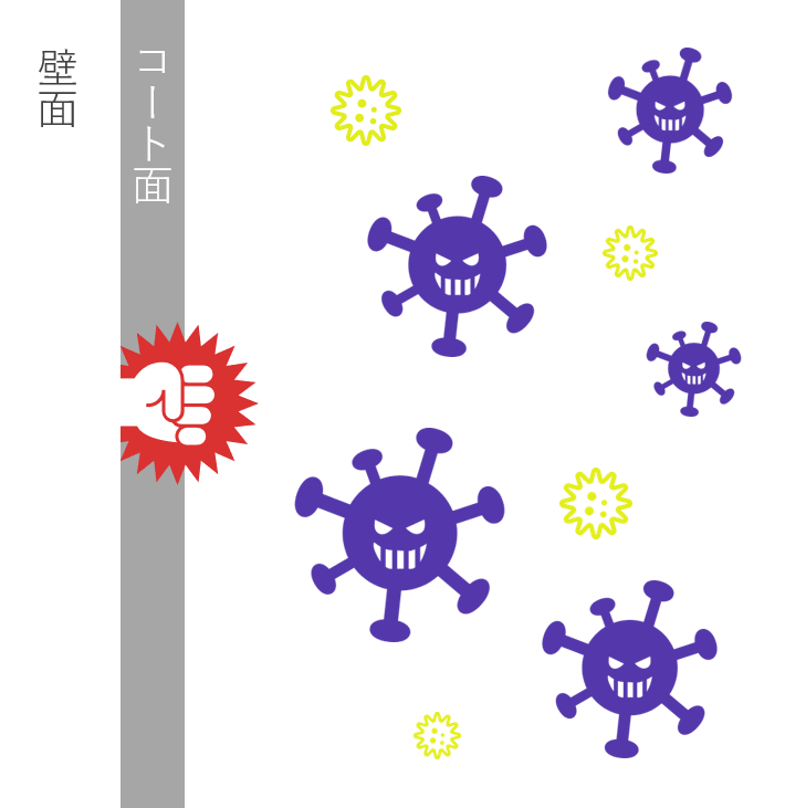 持ち込まれ放出した「菌」や「ウイルス」がコーティング面に触れた時点で、感染能力を失い不活性化します。