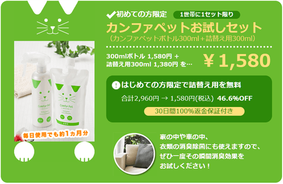 カンファペットはどこに売ってるか見てもホームセンターなど販売店がないほか最安値となる1,580円のほか30日間返金保証が付くところもまだ買ったことがない方にとって嬉しい特典ですね。