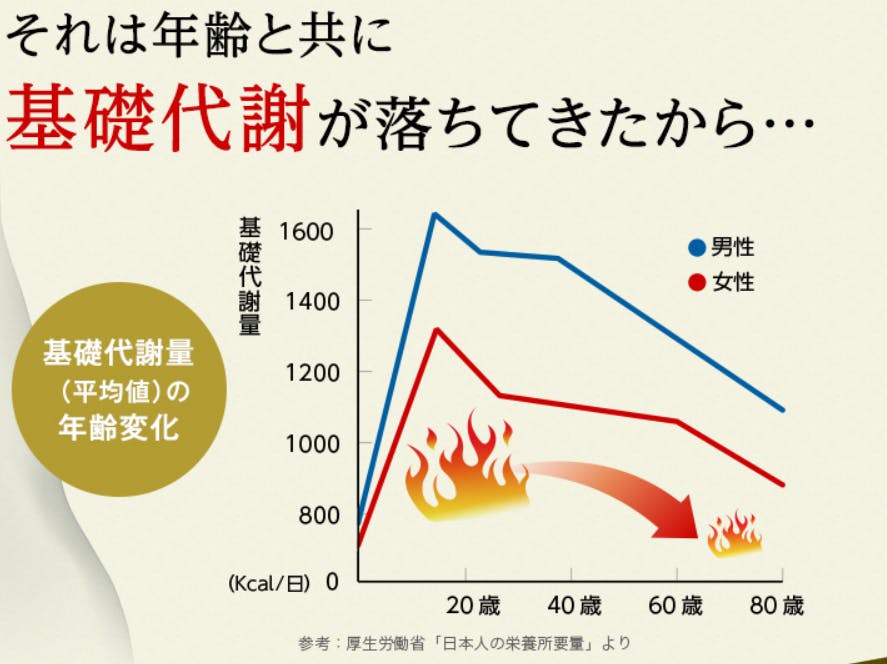 アラプラス糖脂ダウンでも提示されているのが、年齢とともに基礎代謝が落ちていくという事実。