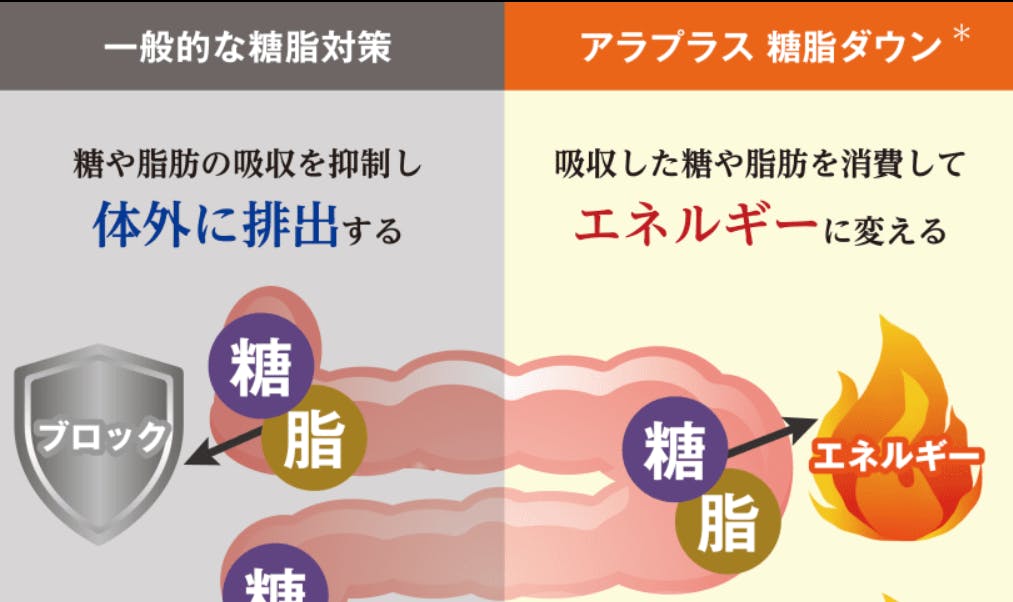 もちろんこれらもやっていくしかないのですが、それでも厳しいという場合、このアラプラス糖脂ダウンのようなアイテムを使って、より糖分、脂肪分を燃焼させやすくするということが必要になるのです。