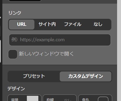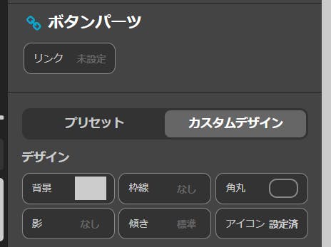 このようなボタンパーツが現れます。このボタンにはリンクが貼れます。他のページに飛ぶことが出来るわけですね。