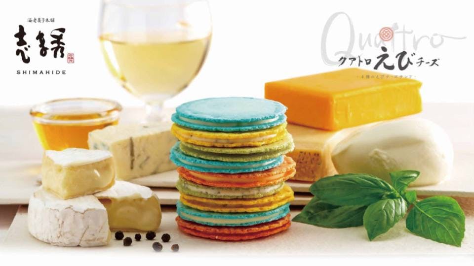 クアトロえびチーズは、香川県の老舗えびせんべいメーカー《志満秀(しまひで)》が手がける、チーズ入りえびせんべいです。