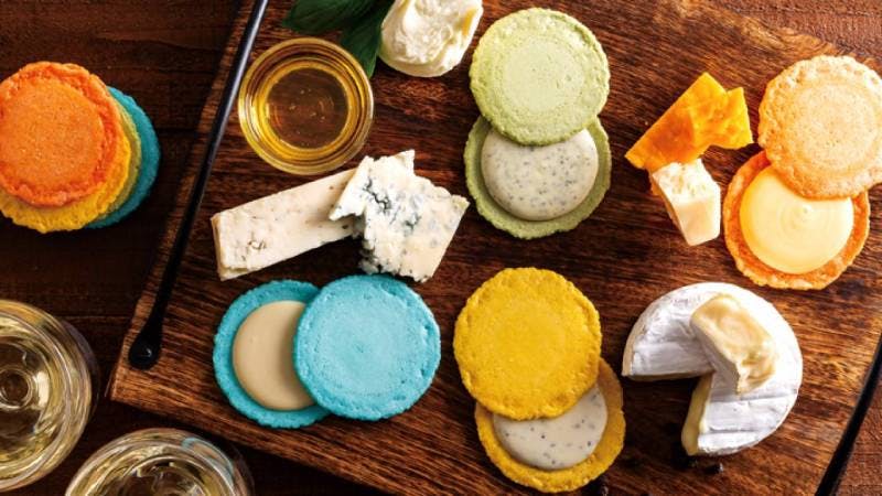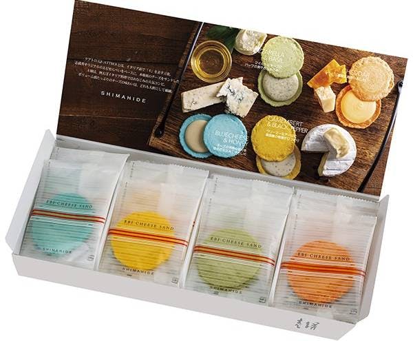 薄焼きのえびせんとチーズの組み合わせ、4種類のフレーバー構成、