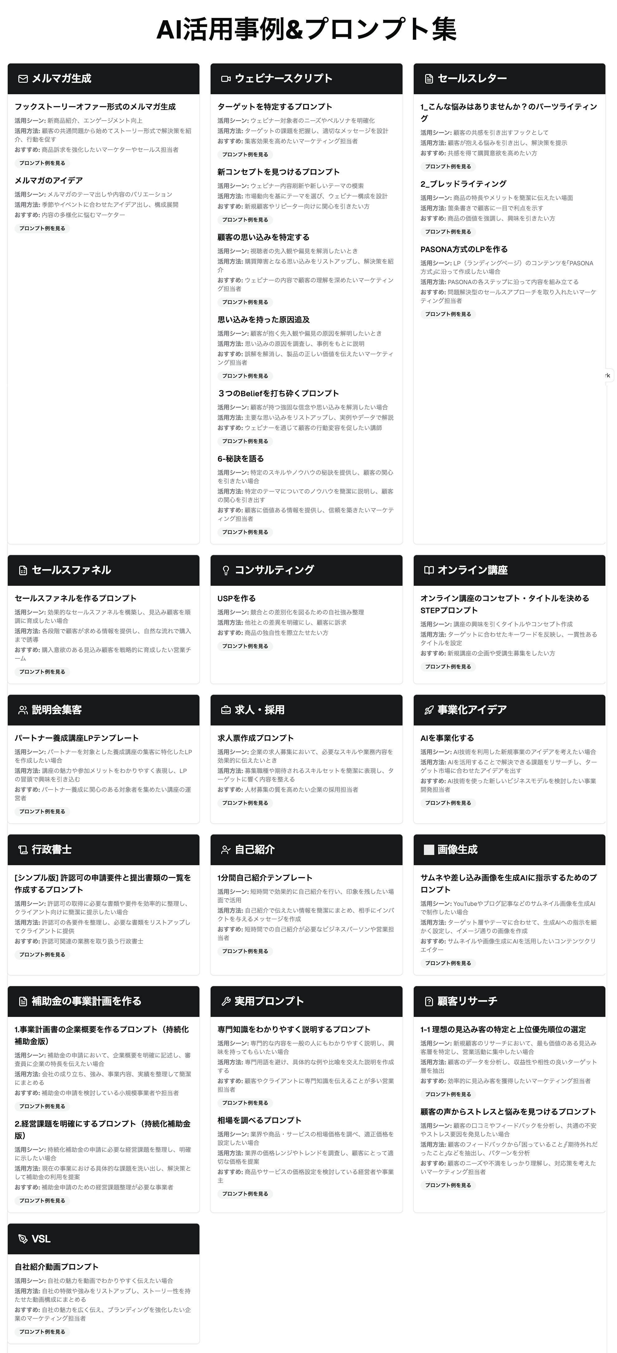 ChatGPTやGemini,Claudeなどに、指示を出してもなかなか良い回答が返ってこない、そういうあなたは、このAIプロンプト集を使ってください。これらは、実際の現場でつか僕たちが使ったり、お客様に納品したプロンプトの厳選したものをまとめたものです。これを使って、あなたがやりたいことに合致したプロンプトを使えば、すぐに活用できます。また、自分流にプロンプトを変えてみると、自分だけのAIプロンプトを作ることができるでしょう