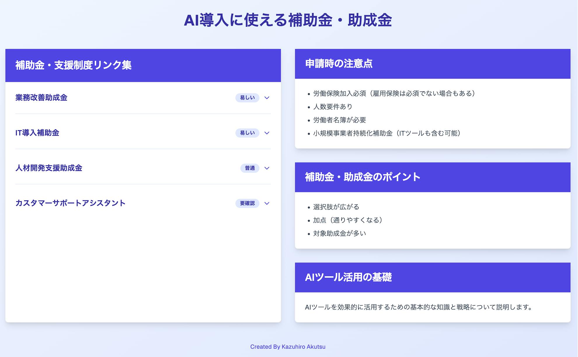 AI導入に使えるメジャーな補助金・助成金のリンク集と、注意点並びに、補助金BOTをまとめたガイドページです。まだ申請したことがないものがあったら、これを見ながら申請する時に使えます。ここに表示されているものは、今すぐ実施すべきものですので、参考にできるでしょう。