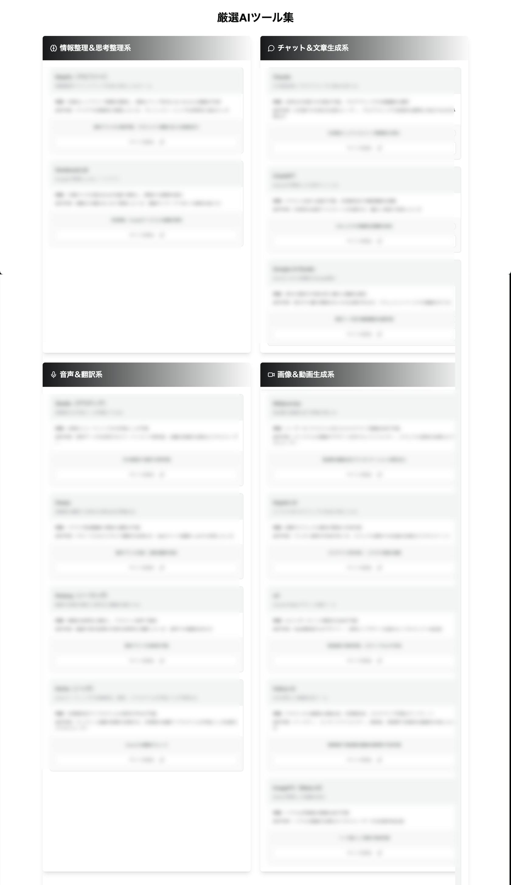 SNSやYoutubeで、たくさんのツールが紹介されていて、みるにはみるけどいまいち、どれを使ったらいいのかわからない、という悩みも多いのではないでしょうか?そこで、この、厳選AIツール集を見れば、実際に僕たちが使っているツールを、用途・使い方・リンクをまとめました。