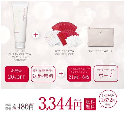 最安値となる上記20%オフはWEB限定キャンペーンという使用ペースに合わせて内容も変更できるマナラホットクレンジングゲル定期注文の価格です。