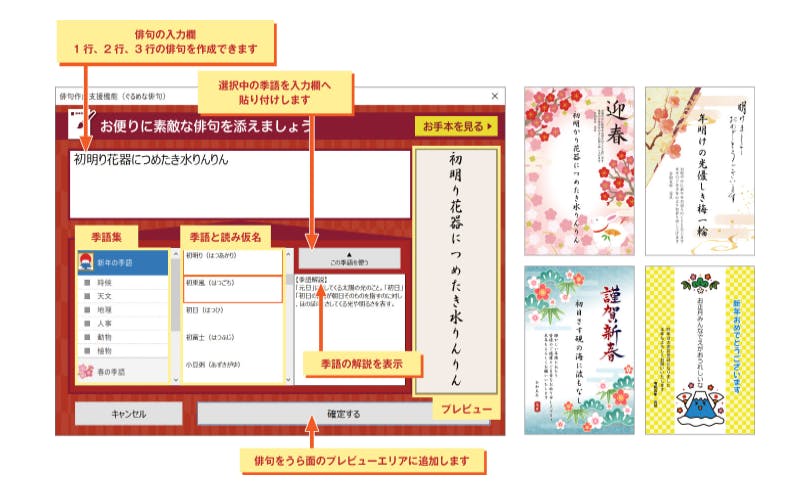 俳人の夏井いつき先生の季語集を収録これで簡単に季語を選んで俳句を作って年賀状にプラス出来ます