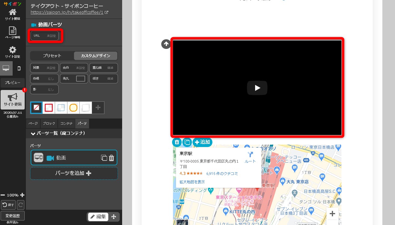 動画をクリックすると操作パネルが「動画パーツ」になりますので「URL」をクリックします。