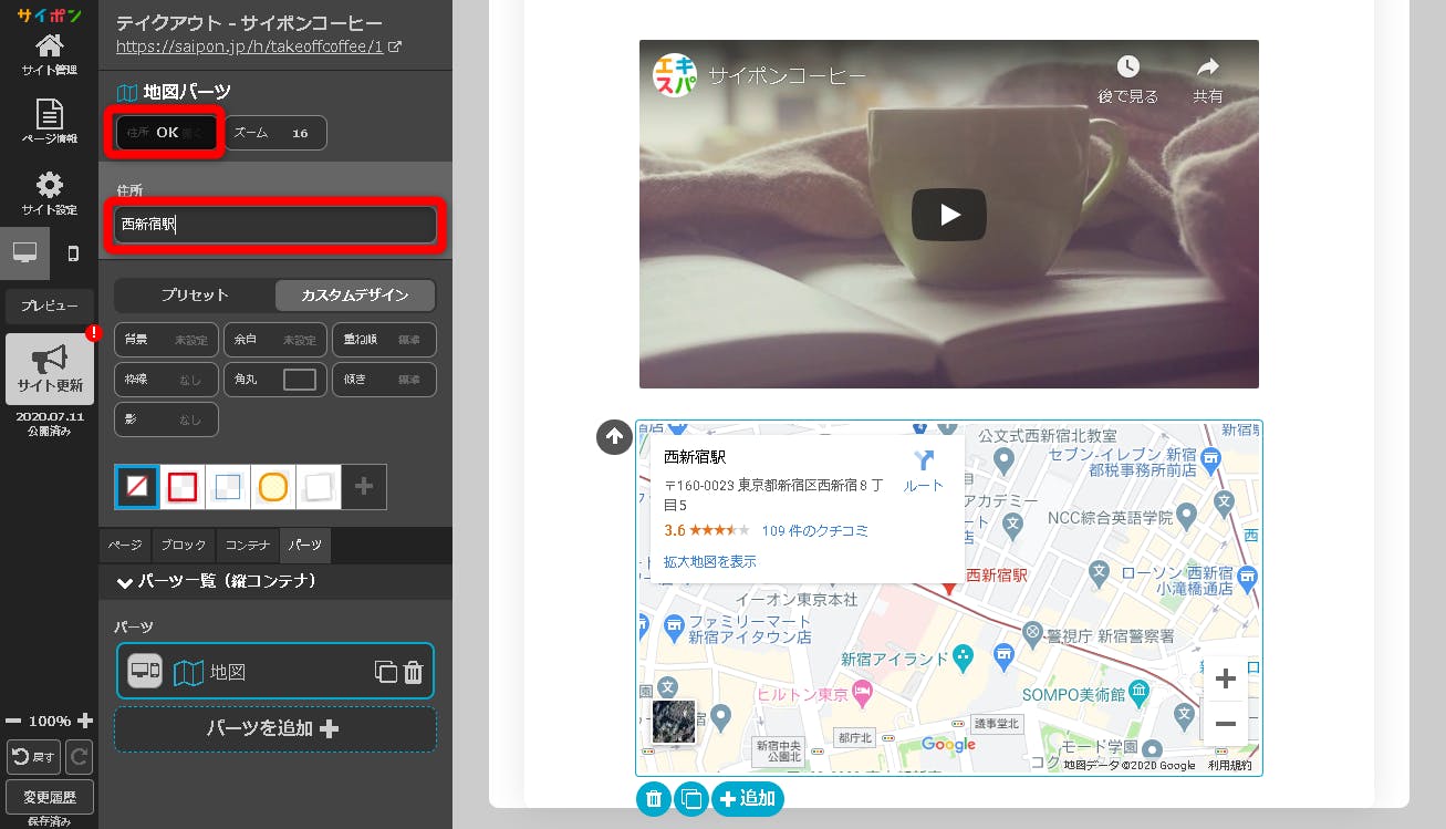 地図をクリックすると操作パネルが「地図パーツ」になります。