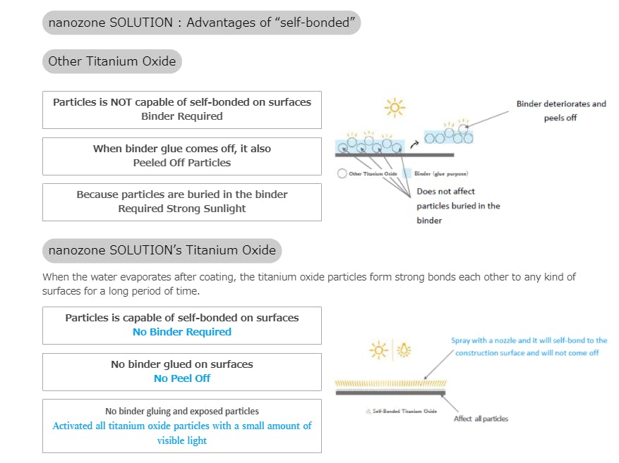 titanium oxide of nanozone SOLUTION absorbs the sunlight, fluorescent lights, LEDs, and other. And generates a strong photo-catalysts activation. Once coated, the effect will last long.