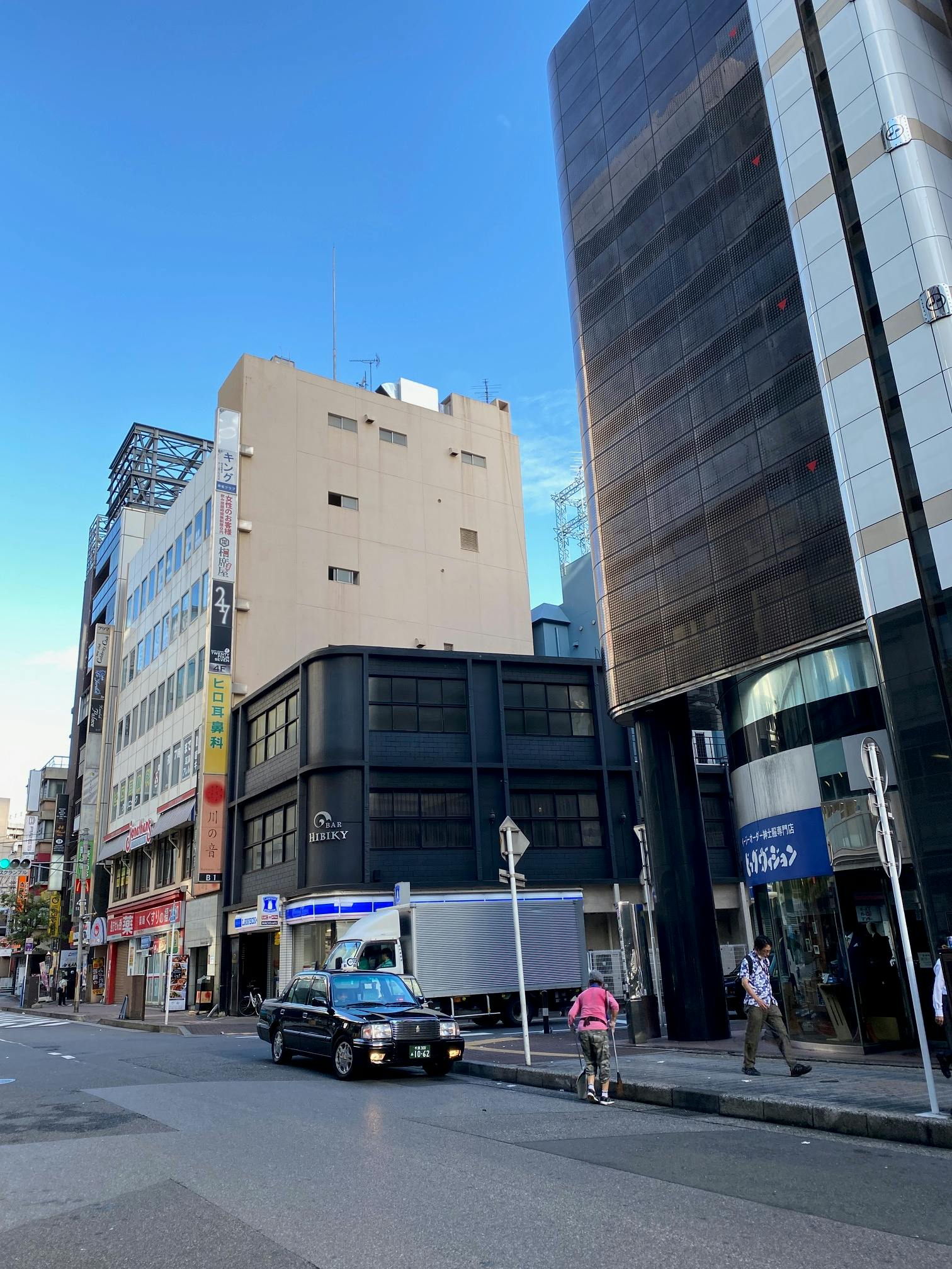 店舗のあるビルの前の道路、繁華街なので結構ごみが散乱しており、清掃の人の姿が見られます。