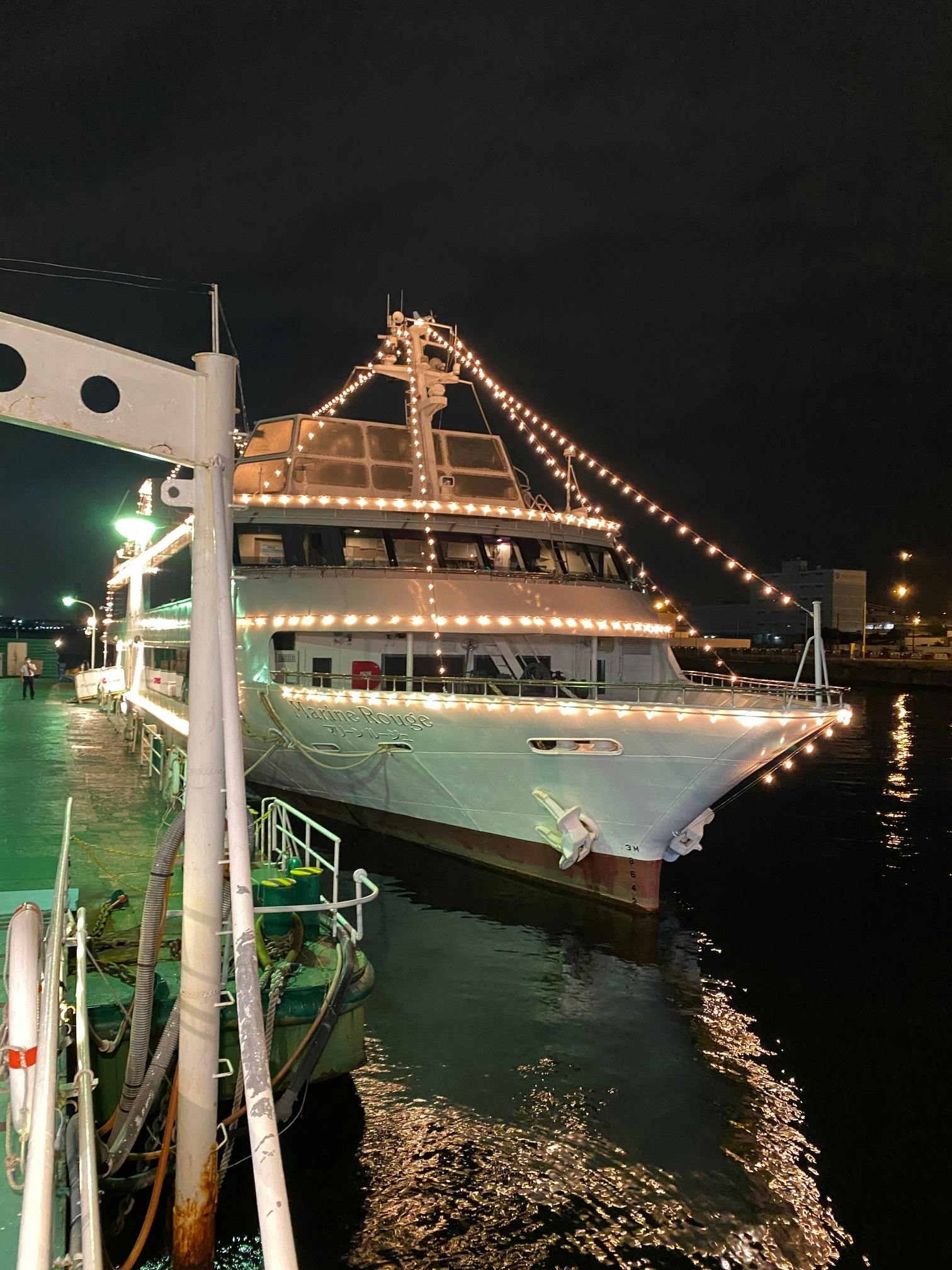 食事後はルーフデッキに出て、ベイブリッジやみなとみらい地区のインターコンチや観覧車などの夜景、カモメの飛来など船上ならではの娯楽を堪能しました。