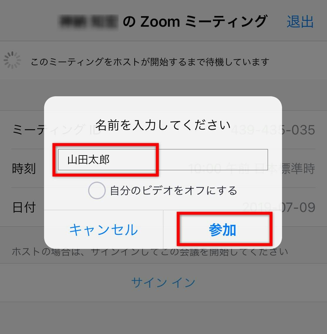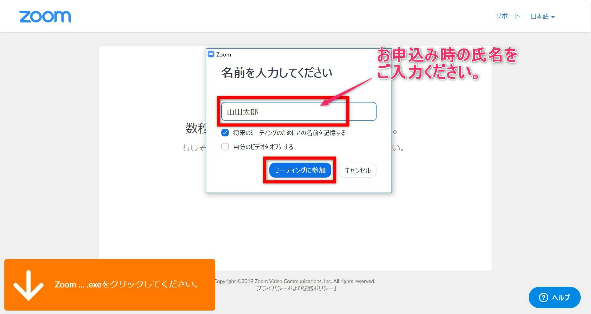 3. 名前を入力し「ミーティングに参加」をクリックします。