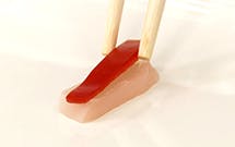 パプリカは色の濃い表皮を薄く切り取り、帆立と同じ大きさの短冊に切る。帆立の上にパプリカを重ねる