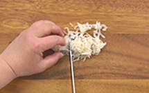 切り干し大根を沸騰湯で5分ゆでる。ザルにあげて冷まし、水けをきって絞る。2㎝の長さに切る