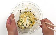 ボールに生ゆばと大和芋を入れてよく混ぜ合わせる。野菜とAを加え混ぜ、合わせたBを加えてさらに混ぜる。