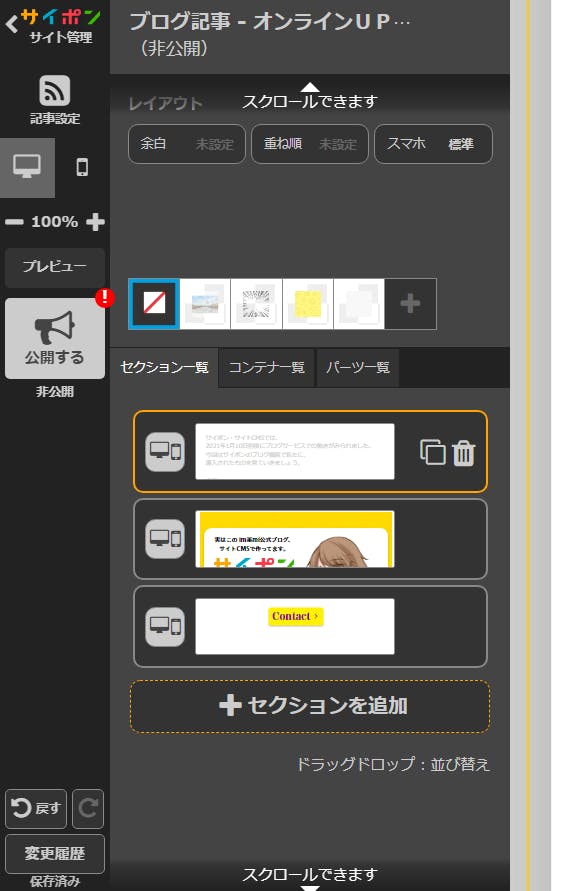 ※テクニック(セクションなどの追加方法は、別にもあります。