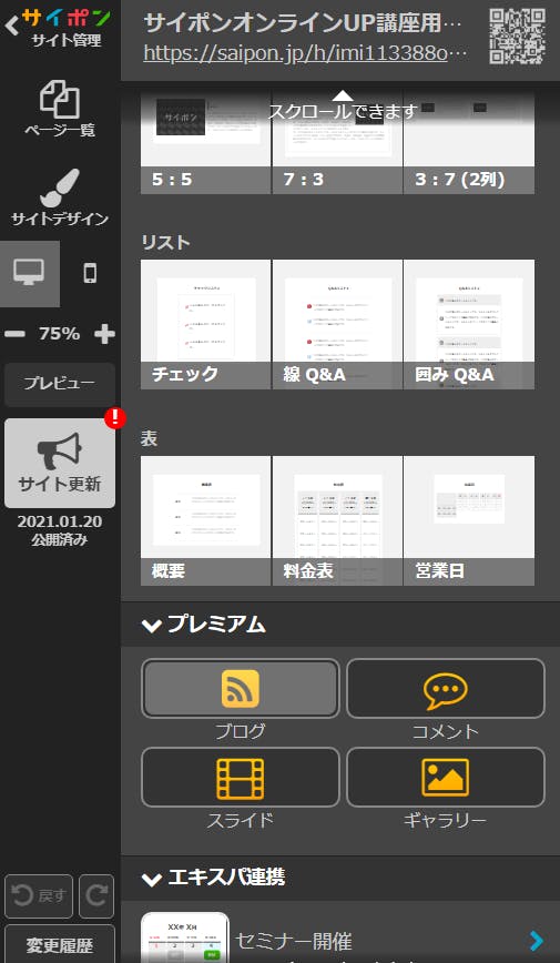 右のサイトデザイン編集ページに、ブログを追加することが出来ます。