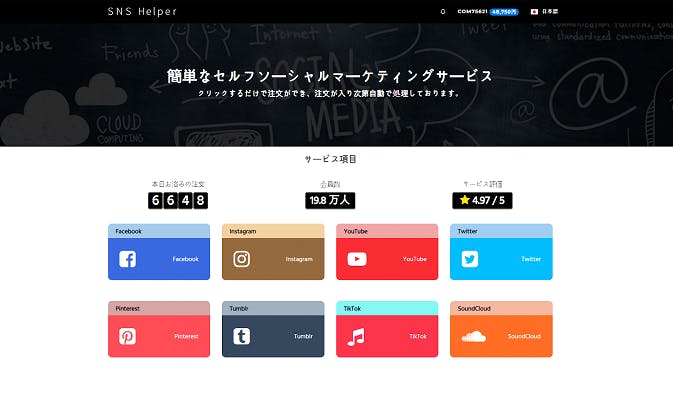 SNSヘルパーは、様々なSNSのフォロワーやいいね等を簡単に購入し、