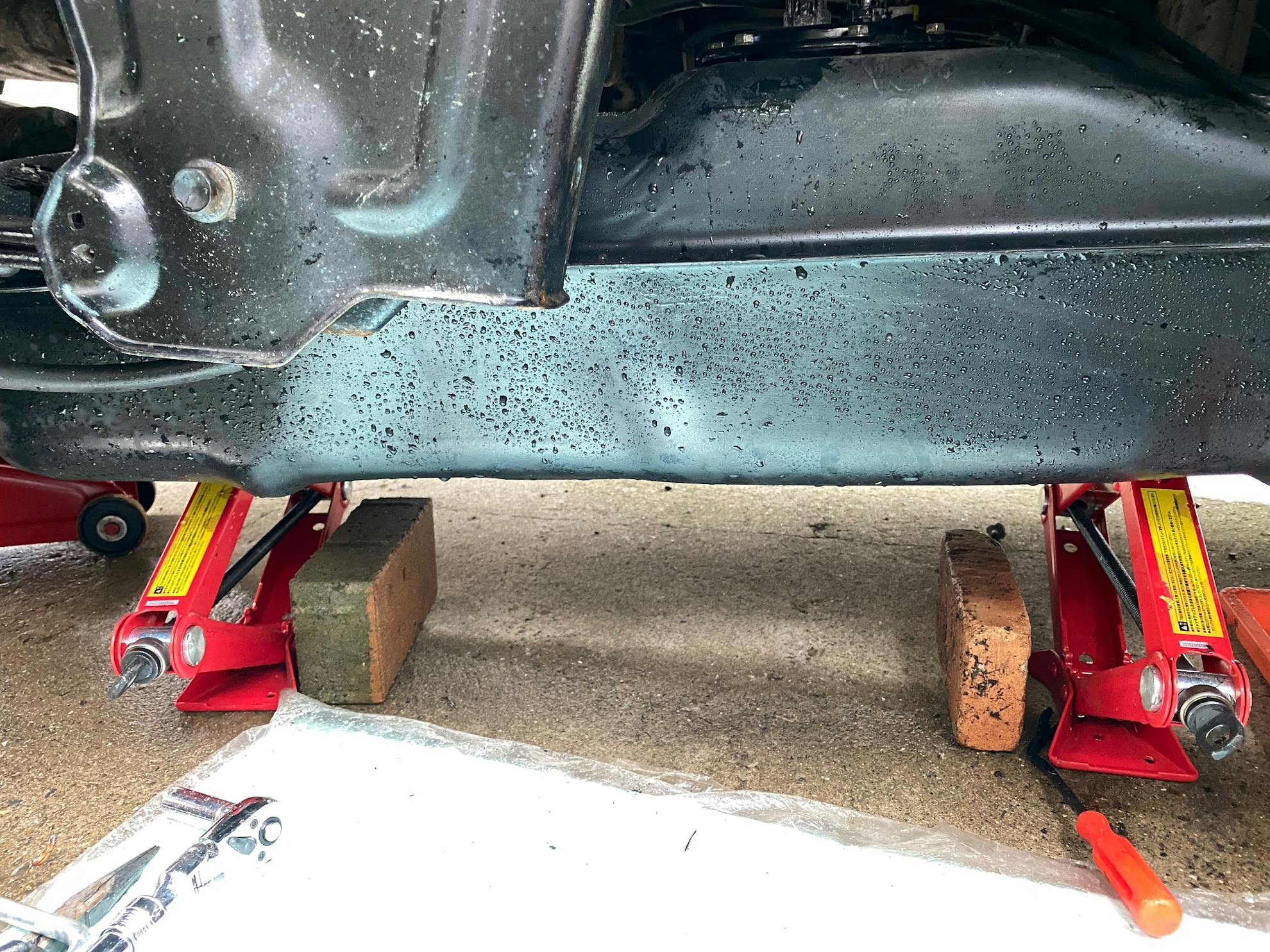 交換用タンクを2個のレンガ上に置きジャッキアップ