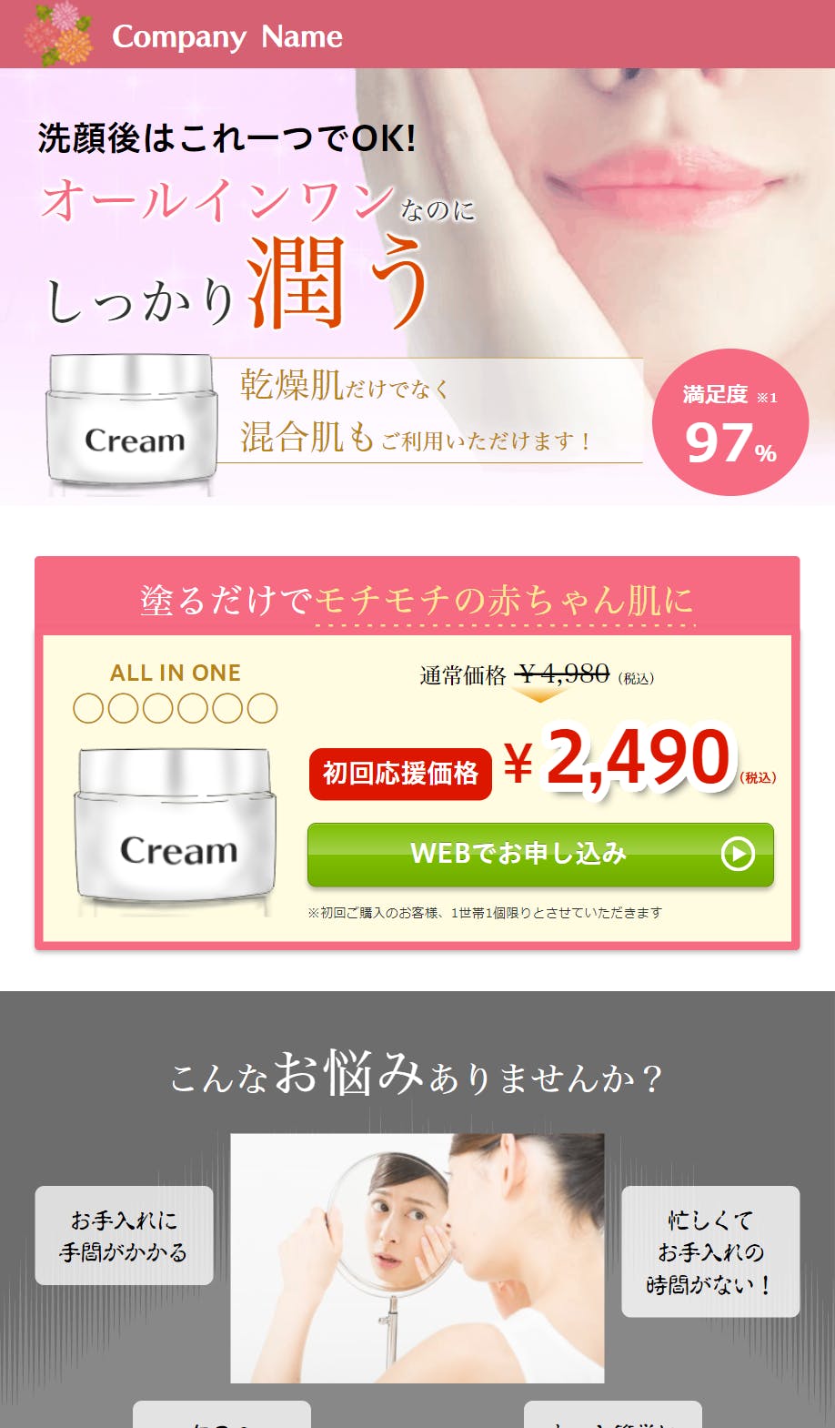 悩みに訴えかけ、その解決策と根拠を提示し、第三者意見を見せることで購買へ繋げます