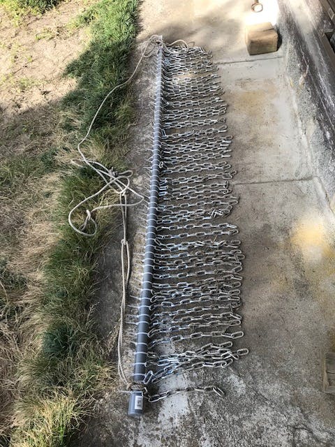塩ビ管(2m)に鎖(30cm×80本) を固定して、引っ張るためのロープを取り付けて完成