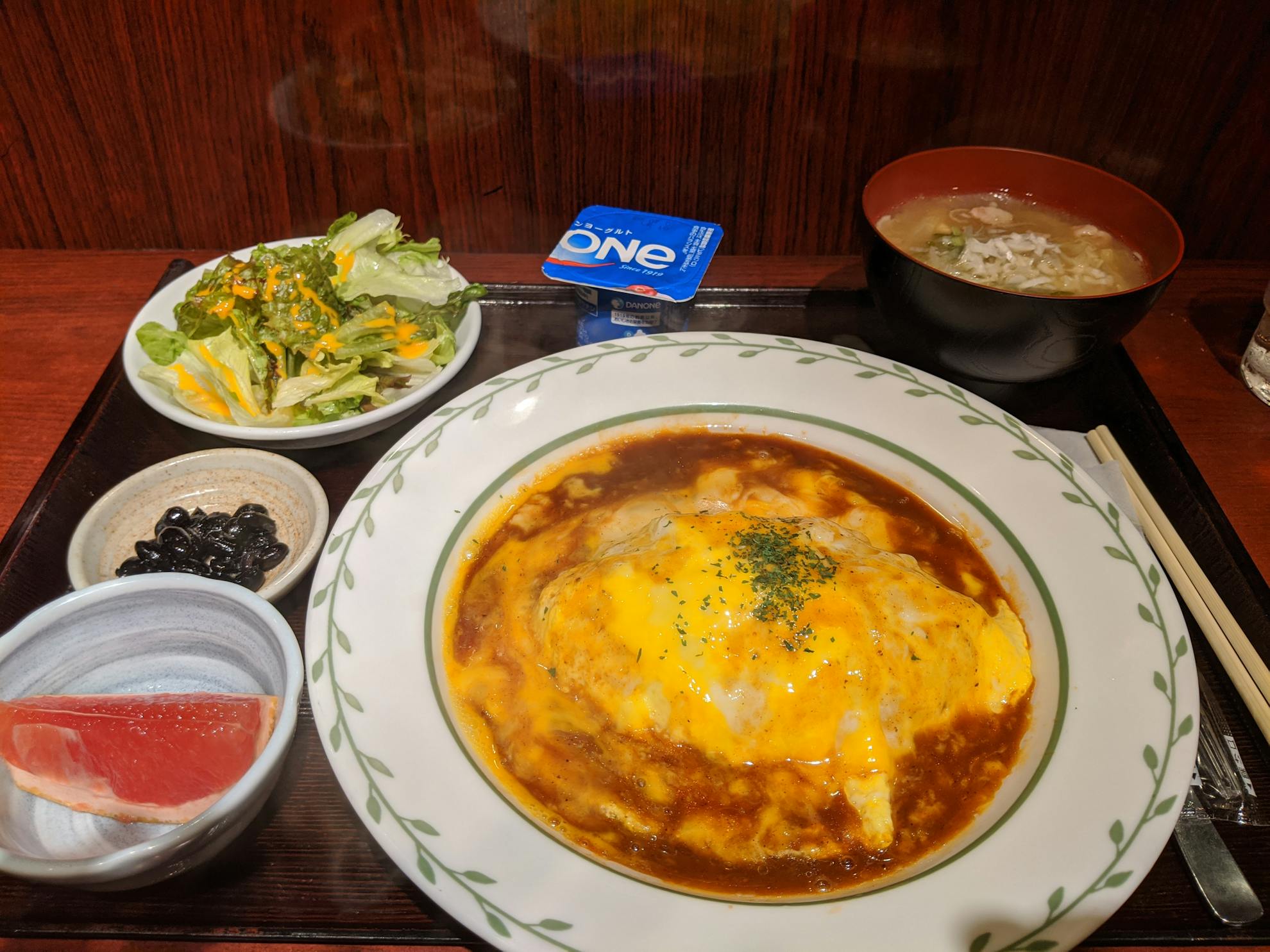 この店のはケチャップライスで具材は玉葱のみだけど、ソースと相性バッチリで美味しかったなぁ。付け合わせは何故か黒豆とサラダ。まず自分で買う事は無いグレープフルーツ。