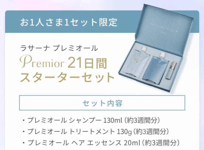 21日間スターターセットには、プレミオール シャンプー 130ml、プレミオール トリートメント 130g、プレミオール ヘアエッセンス 20mlが入っています。