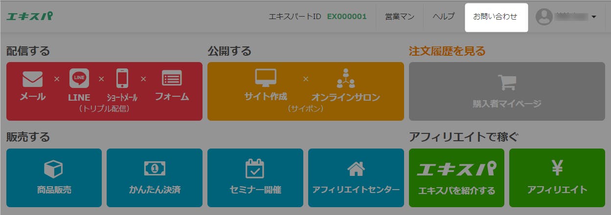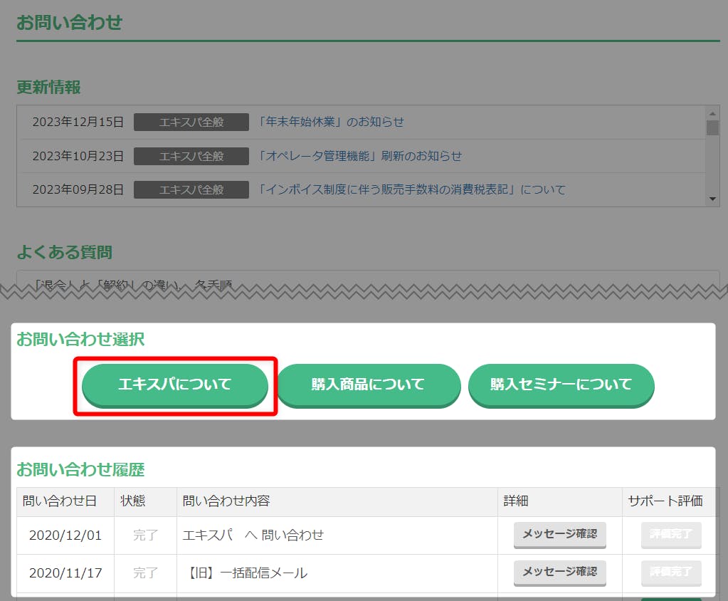 1.エキスパにログイン後、「お問い合わせ」をクリック
