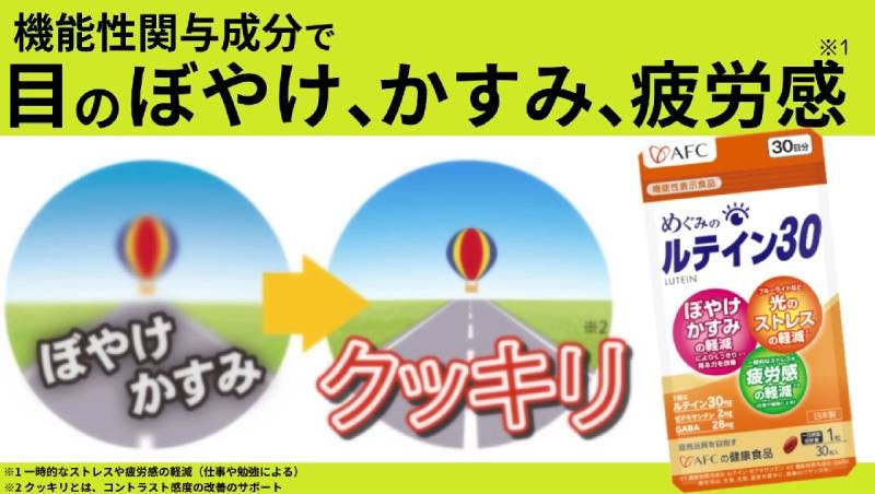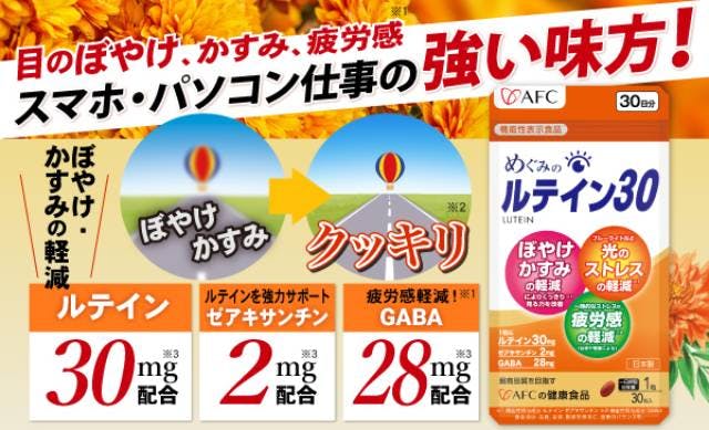めぐみのルテイン30は、AFCから案内されている機能性表示食品のカプセルタイプサプリです。1日1粒目安・30日分として販売されていて、機能性関与成分としてルテイン30mg、ゼアキサンチン2mg、GABA28mgが配合されています。