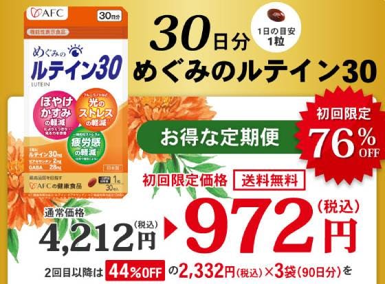 めぐみのルテイン30は、AFC公式オンラインショップで案内されている商品です。公式ページでは、機能性表示食品、1日1粒目安、30日分、ルテイン30mg・ゼアキサンチン2mg・GABA28mg配合といった基本情報をまとめて確認できます。まずは商品内容をしっかり見ておきたいときに確認しやすい購入先です。