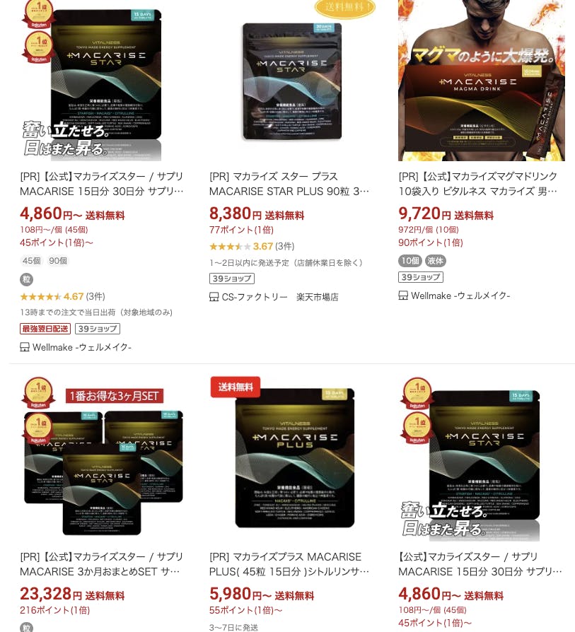 楽天には、多くの販売店でマカライズスターが出品されています。中には複数個で出品されている販売店もあり、お得に購入することができます。