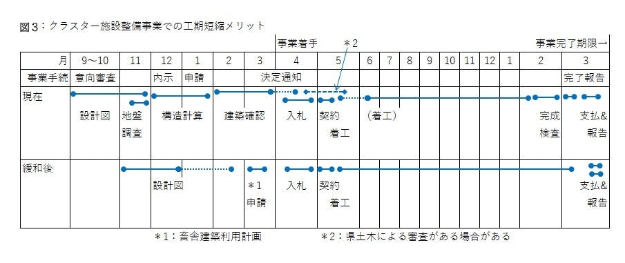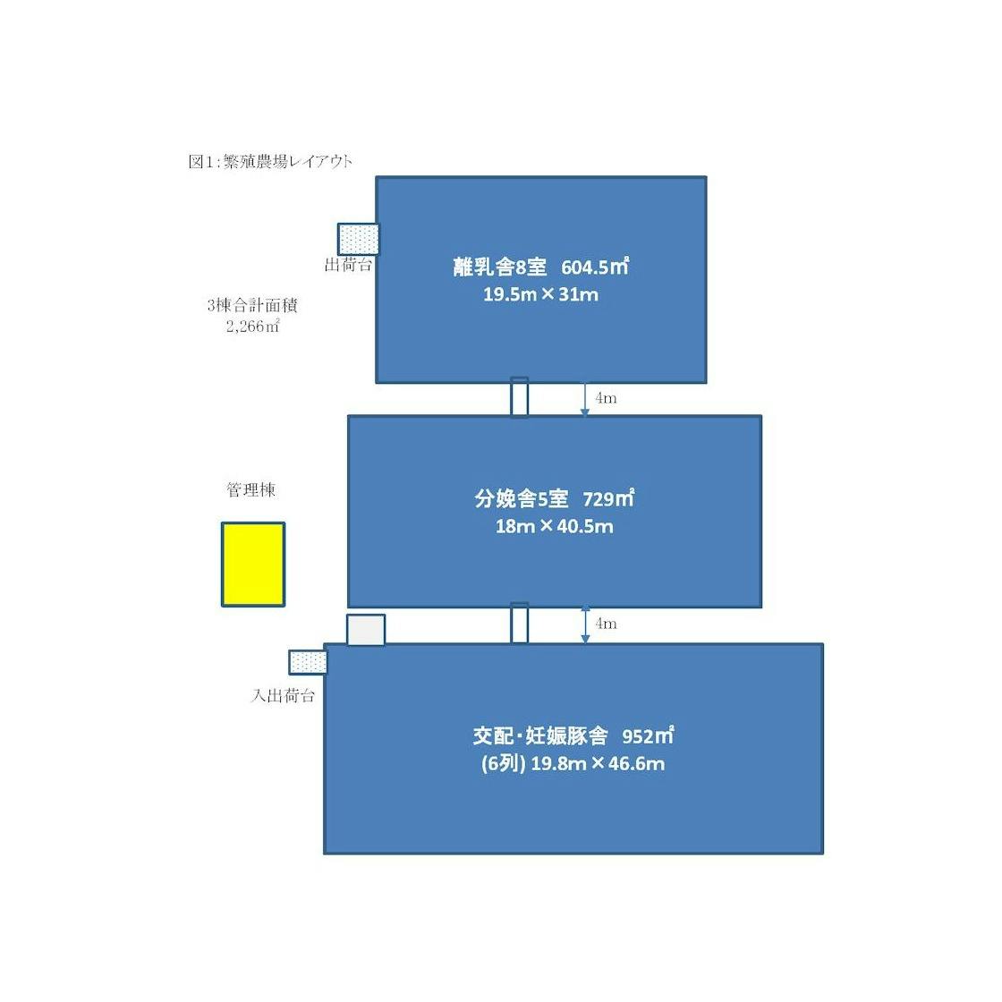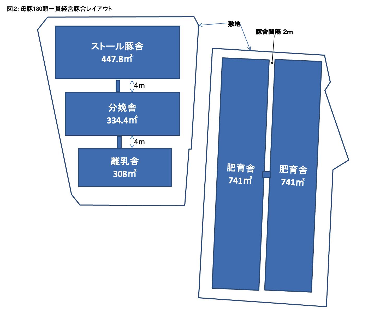 実際のメリットとしては、豚舎と豚舎を通路で繋いで、合計の面積が3,000㎡未満なら、建物の間隔は狭くともOKになったことです。従来の建築基準では6m以上空ける必要がありました。図1は令和4年度の畜産クラスター施設整備で建てた母豚350頭規模繁殖豚舎のレイアウトです。敷地が狭かったので、豚舎間隔は4mです。従来の建築基準では母豚300頭規模の豚舎しか建てられませんでした。図2は令和6年度の畜産クラスター施設整備で建てた母豚180頭規一貫経営豚舎のレイアウトです。こちらも従来の建築基準では母豚150頭一貫豚舎しか建てられませんでした。