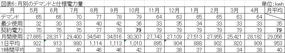 図表6が月別のデマンドと使用電力量です。デマンド(30分単位の1日最大使用量)は79kwですが、デマンド値は季節によって変わります。一番少ない時期は63kwでした。しかし日ごとに見ると50kw~60kwぐらいでした。そこで太陽光発電設備の容量を50kwに設定しました。過大な設備を作ると、余った電力を売電できないので損をしますし、設備コストも多くなります。太陽光発電設備工事会社からの見積金額は、消費税抜き12,000,000円でした。太陽光パネルの保証は20年ですが、パワーコンディショナーは10年ですから、パワーコンディショナーの交換費用約80万円も合わせてみておかなければなりません。ですから設備費合計額は12,800,000円になります。