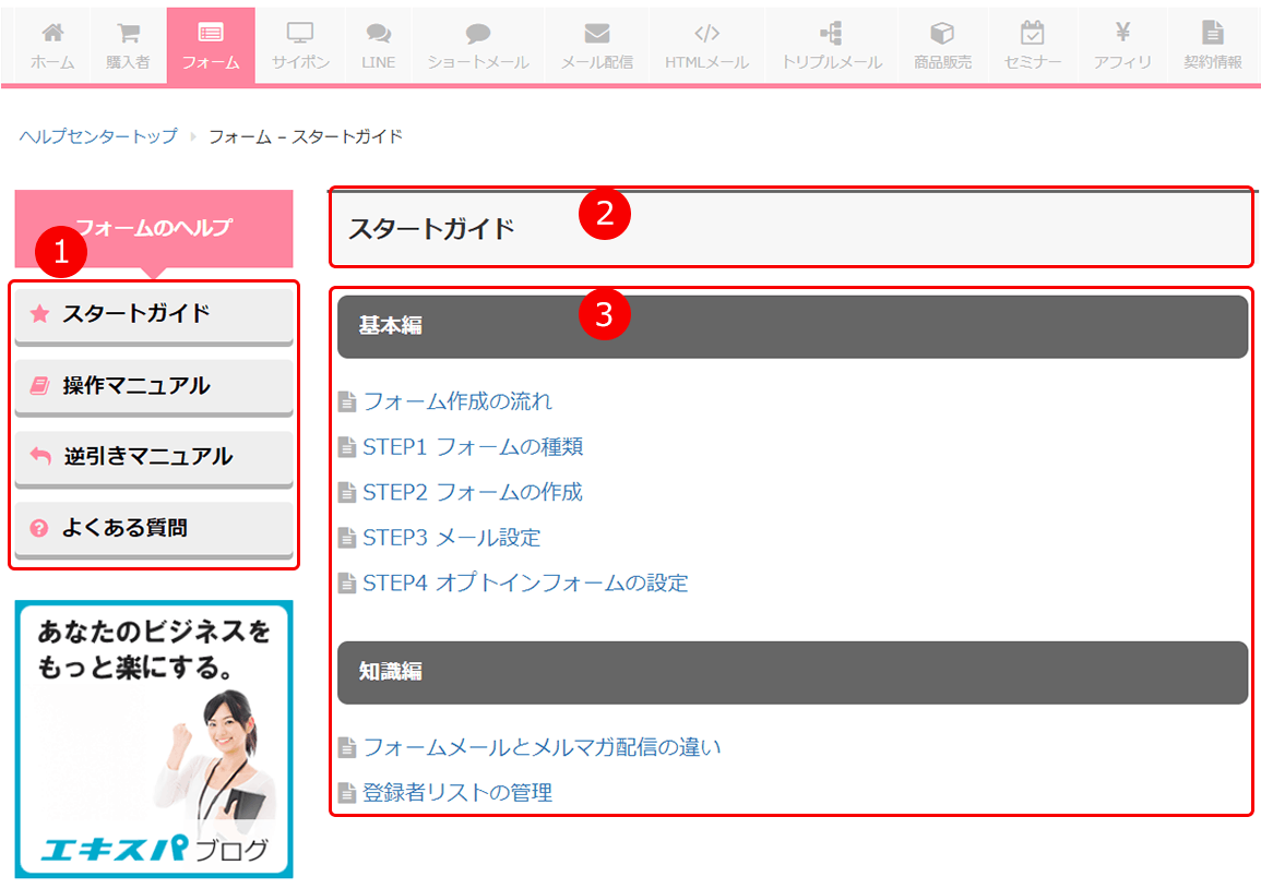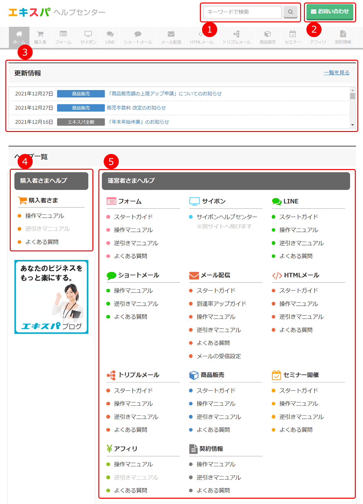 エキスパをビジネス利用している方のマニュアルです。機能ごとに分かれています。