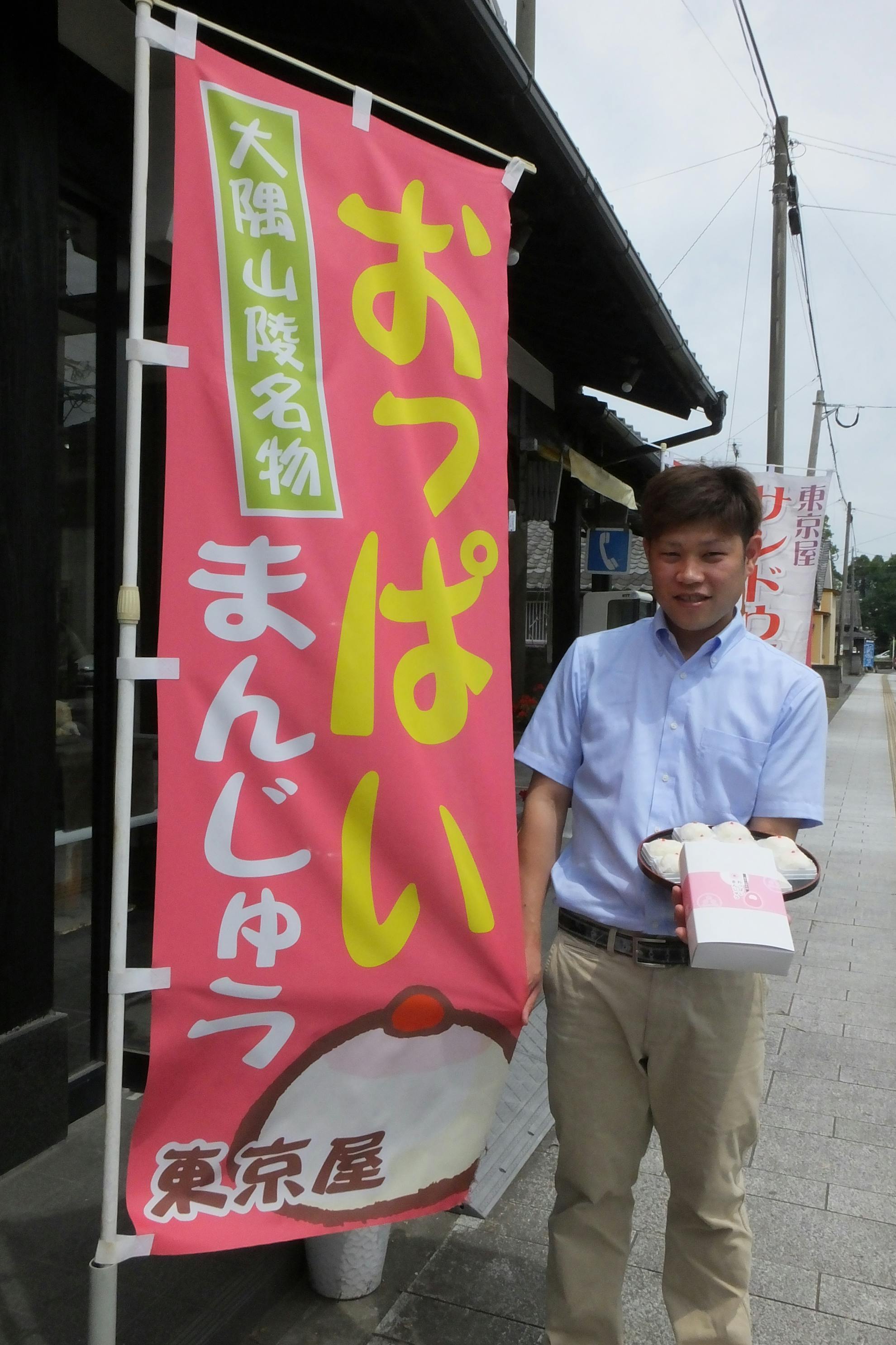吾平の伝説にちなんだ「おっぱいまんじゅう」を新発売した吾平町麓、東京屋菓子店の渡辺慶平(きょうへい)さん(31)。