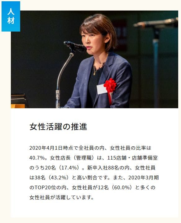 女性活躍の推進というのも今風?時流に合わせた会社戦略だよね。女性社員の比率が、40.7%、女性管理職が17.4%ですって。