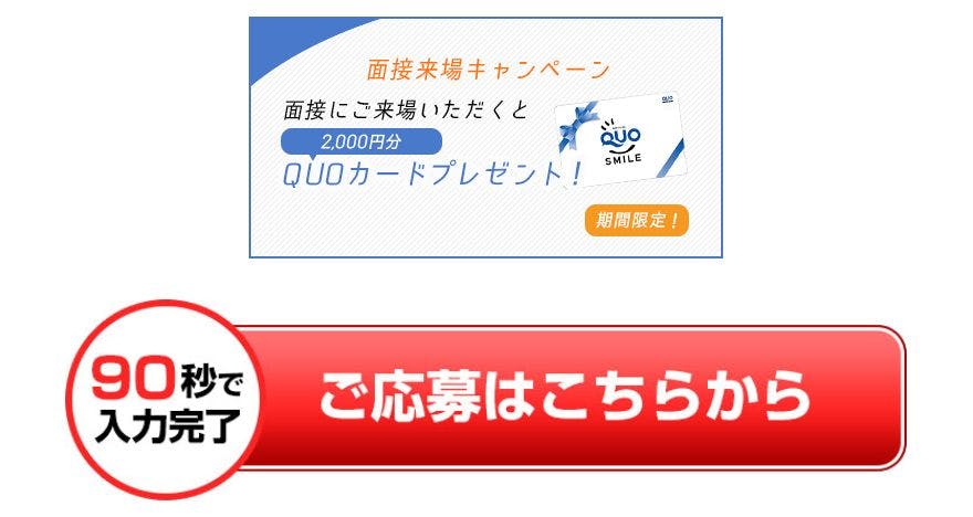 面接に行くだけで2000円分のQUOカードもらえるし、90秒で応募入力完了するから目先のコスパ?が超イイ!