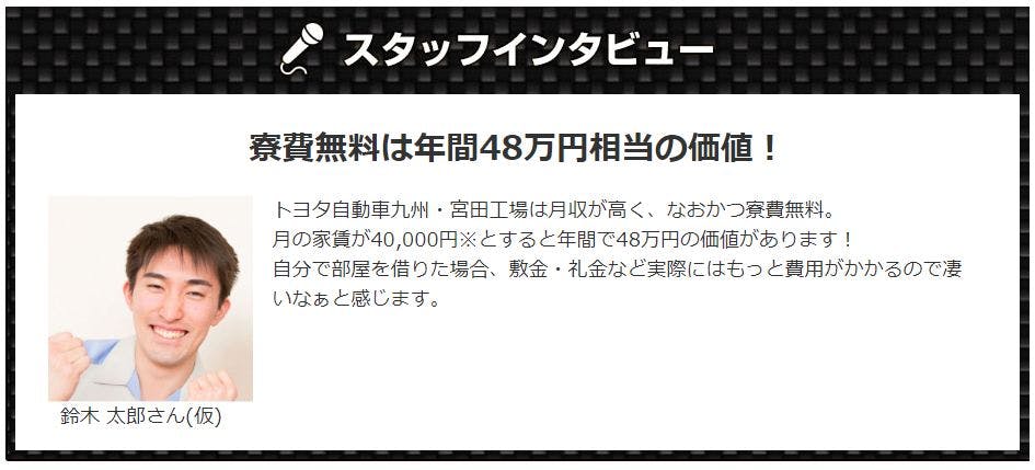 「トヨタ自動車九州・宮田工場は月収が高く、なおかつ寮費無料。月の家賃が40,000円(※とすると年間で48万円の価値があります!)